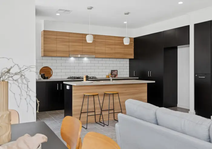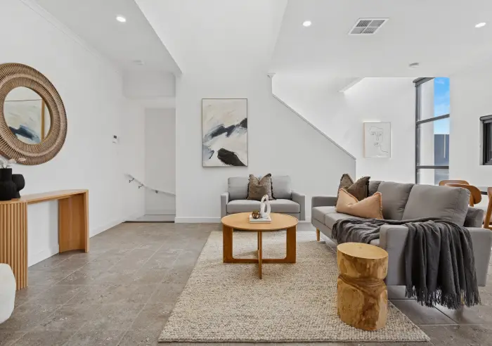 The upper level incorporates two generous size bedrooms both complete with mirrored glass built-in-robes. Designed for health and well-being the principal bedroom also incorporates a good size balcony perfect for relaxing on a Sunday morning. Adjacent the two bedrooms is the main bathroom with a generous shower, toilet and vanity. The main bathroom has a contemporary edge with matte black tapware and shower head, contrasting well with the white wall tiles. In addition, the upper level incorporates a split-level roof line projecting natural light throughout.